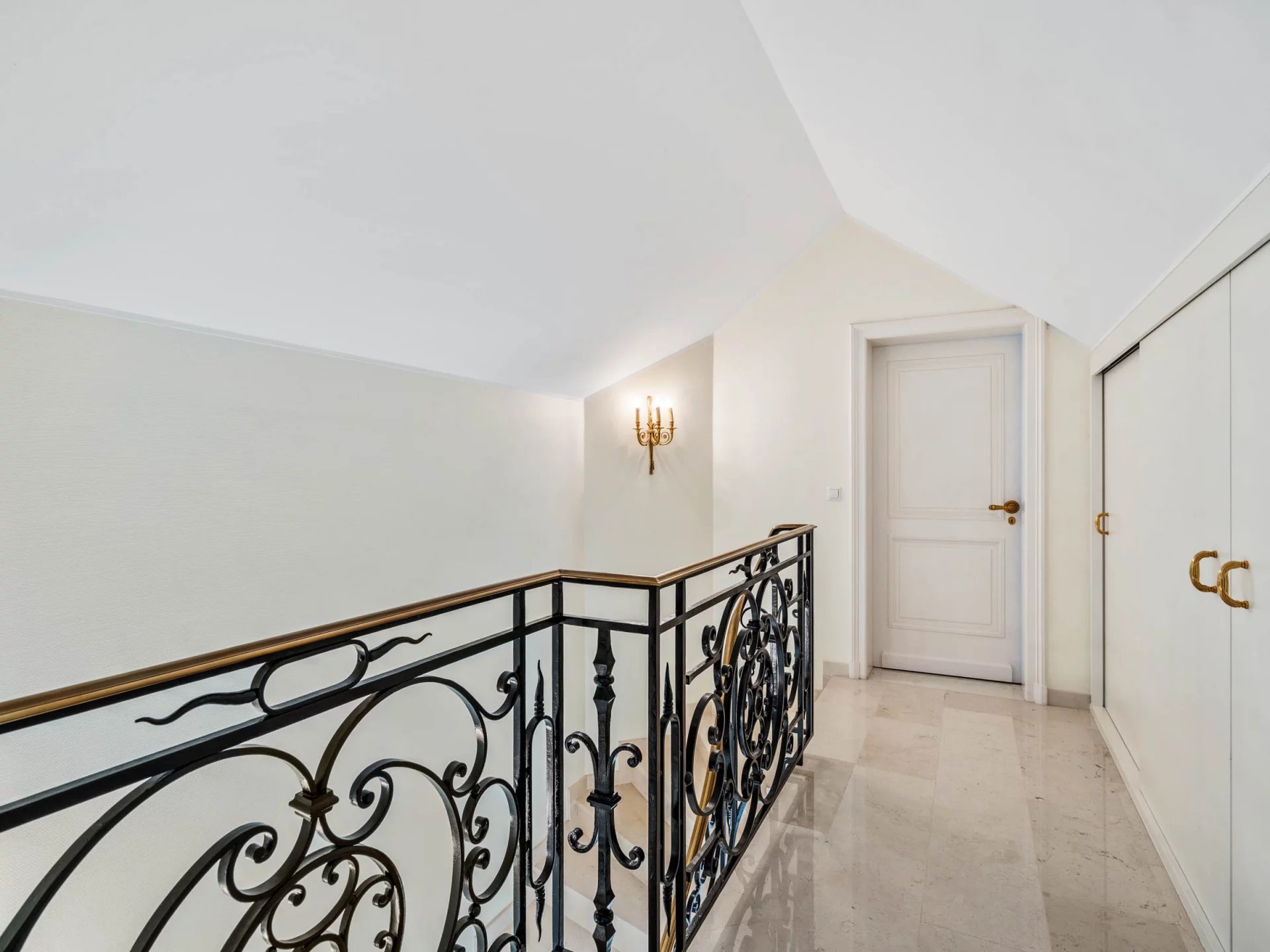 Le vaste hall d’entrée donne le ton de cette maison imaginée pour recevoir. Le rez-de-chaussée accueille entre autres un premier salon de ±35,5m² et une grande cuisine reliée par un monte-plats à un office attenant à la salle-à-manger située au 1er étage, où un 2ème salon de ±36m² et salle de réception de ±60m² offrent de belles possibilités.